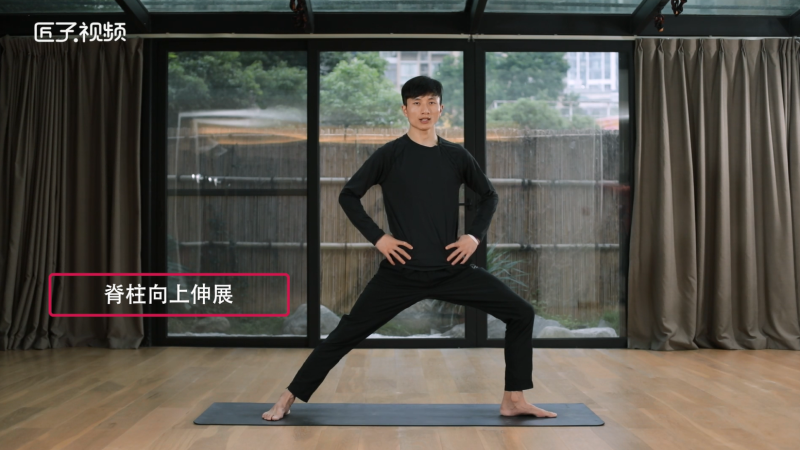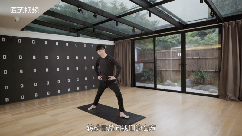 1、三四站姿,双手扶髋,侧右腿向后一大步,慢慢转动双脚,转动骨盆到右边,身体会朝向右方呼气;