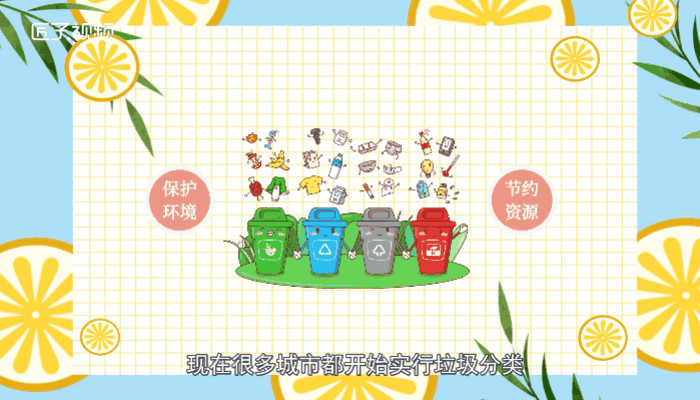 为了保护环境,节约资源,现在很多城市都开始实行垃圾分类。垃圾一般被分为可回收垃圾、厨余垃圾、有害垃圾以及其他垃圾。