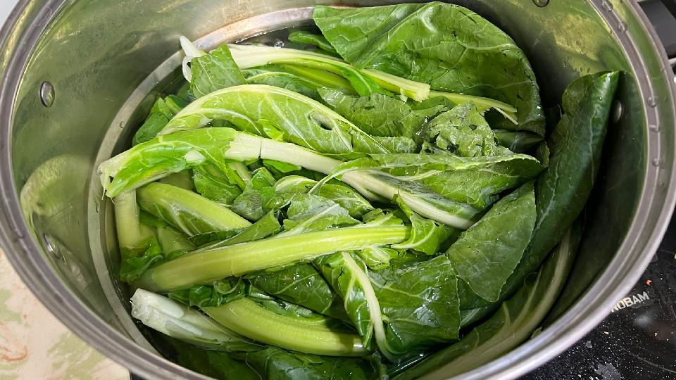 第二步:锅中加水烧开,加一小勺盐可以保持颜色翠绿,放入叶子焯水,它的茎稍微硬一点,多煮一会儿,变软后即可捞出。
