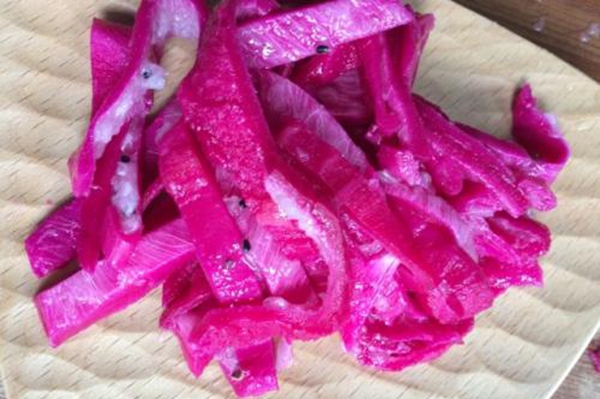 将火龙果皮处置清洁之后榨汁,和面的时间用这种汁液取代净水,而后用戴着火龙果汁液的面团来干面条等等,瞅起来格式更是漂亮,吃起来味讲也很特殊。