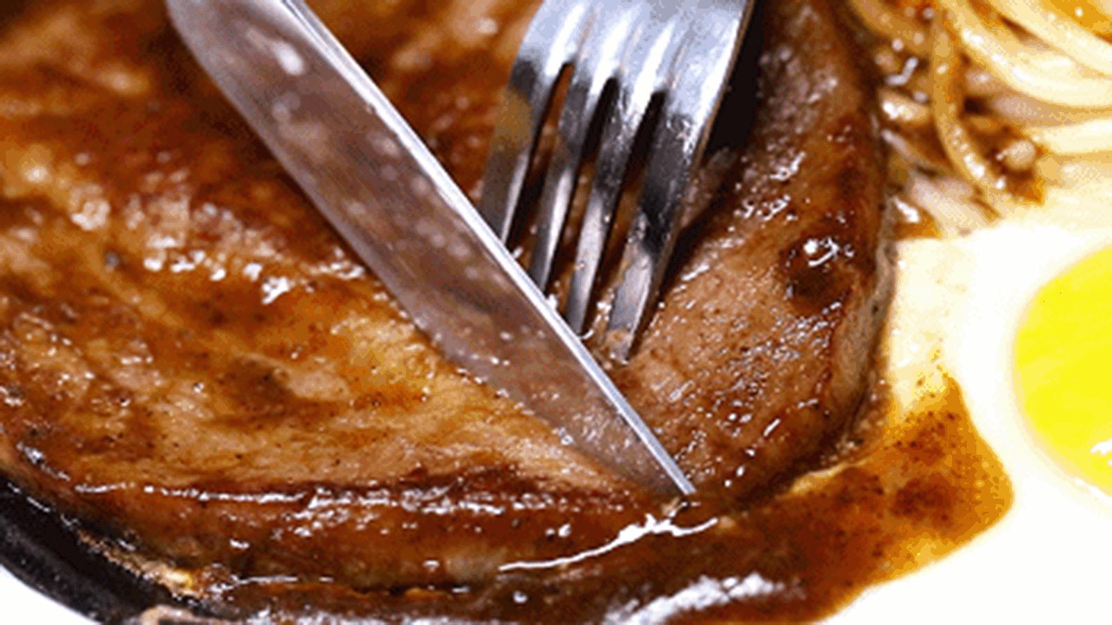 4、吃牛排时,两唇合拢,不要出声。口中食物未吞下,不要再送入口中。切忌先切成碎块(此为英式,美式可以先切块),不但不雅,而且肉汁流失,殊为可惜。