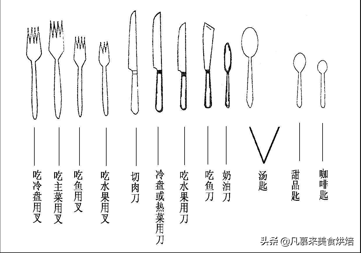 冷盘用叉、吃鱼用银刀叉、吃肉用钢刀叉、吃生菜用叉、布丁或者点心用叉或者匙、水果用刀叉。