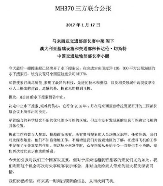 ○中马澳三国联合声明:马航MH370客机水下搜寻暂告中止