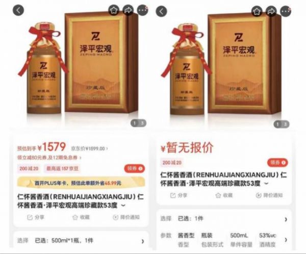 近日,一款名为“泽平宏观”的酱香白酒在京东销售,该酒京东售价为1579元,经营店铺名称为“仁怀酒类专营店”。据了解,这款产品正是任泽平与仁怀酒的合作款,售价也达到一千元以上的高端价位。然而虽说是授权合作,“泽平宏观”这款白酒的商标却还未正式注册。