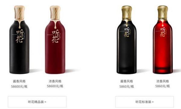 青海春天的听花酒系列产品包括标准装与精品装,均为750ml装,也均有浓香(52度)与酱香(53度)两种风格。其中,标准装听花酒官方指导价为5860元/瓶,而精品装听花酒官方指导价为58600元/瓶。