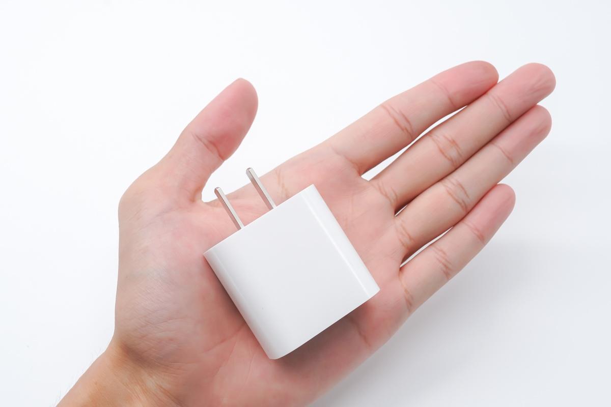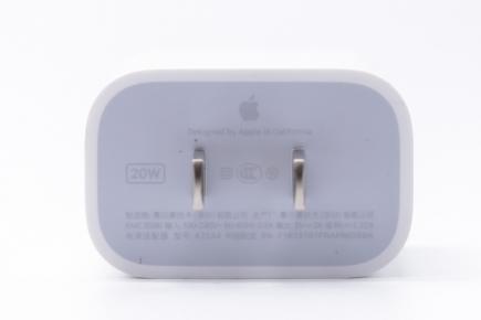 苹果20W PD充电器采用白色PC阻燃外壳,四周圆滑,顶部和底部为平面结构,外观上也是熟悉的造型。
