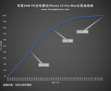 将苹果20W PD充电器为iPhone 13 Pro Max充电全程的数据绘制成曲线图,可以看到,在半小时的时候充电42%,1小时充电78%,完全充满需要2小时11分。