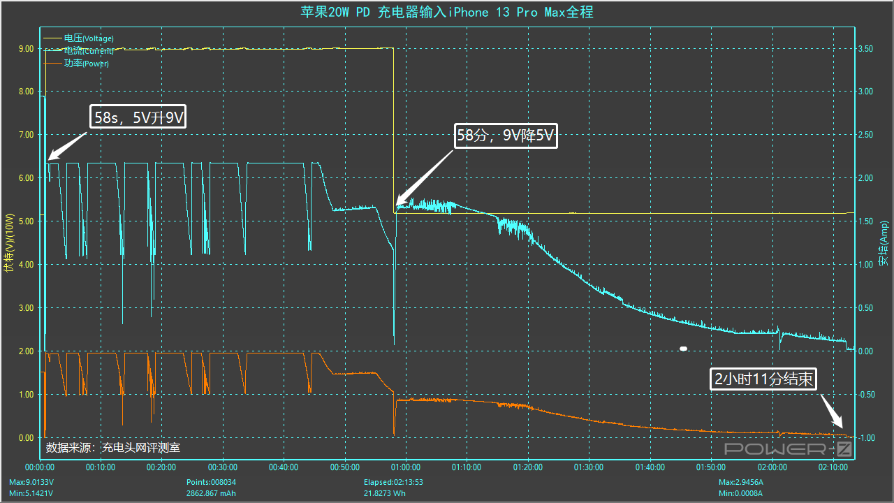 使用苹果20W PD充电器为iPhone 13 Pro Max充电,在58s时电压由5V升至9V,充电进入PD快充状态,在58分时电压由9V降至5V输入,随后在2小时11分时测试停止。最高功率为8.97V 2.17A 19.51W。