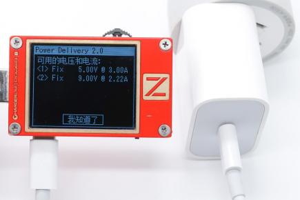 协议方面,使用ChargerLAB的POWER-Z KT002读取充电器的快充协议,实测充电器支持PD2.0快充协议。