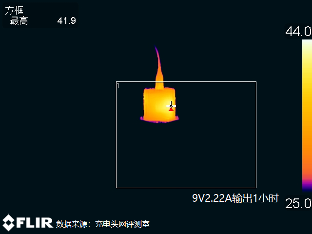 前面提到了充电器在工作时会涉及到转换效率的问题,其中损耗的部分大多是以热量的形式散发,所以此次也增设了苹果20W PD充电器的温升方面的测试。测试条件为让充电器以9V2.22A档位持续输出1小时后采集表面的温度,测试基于25℃的恒温箱内进行。