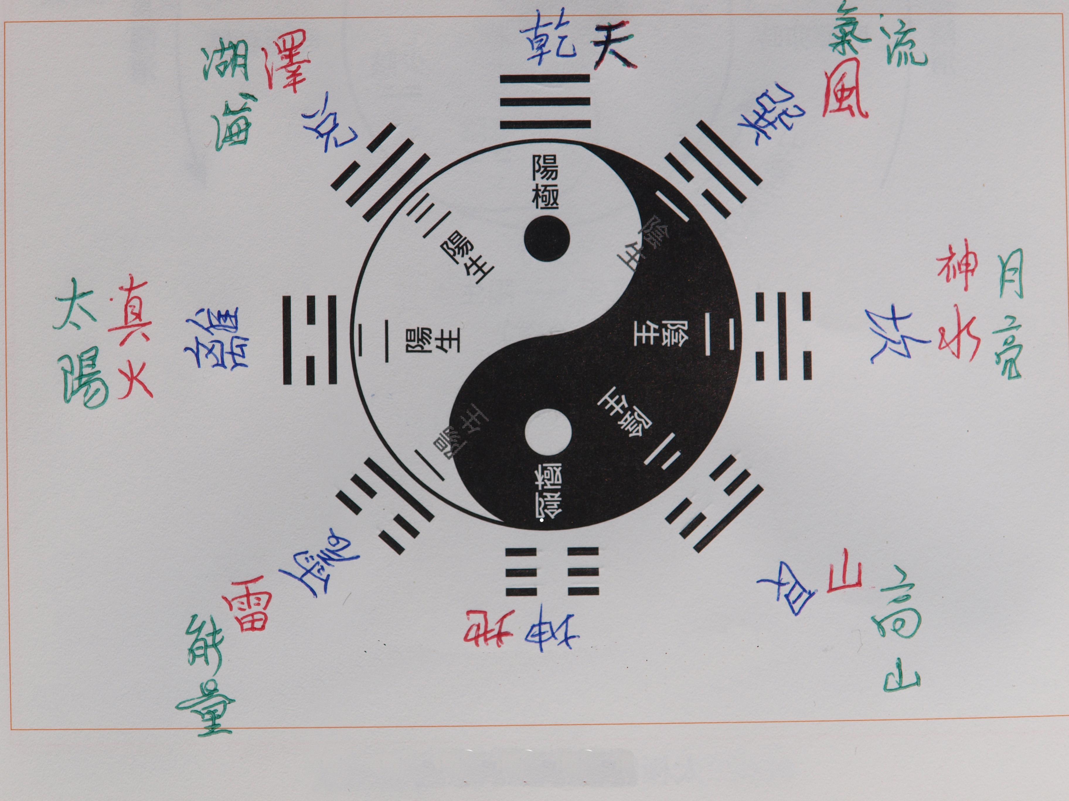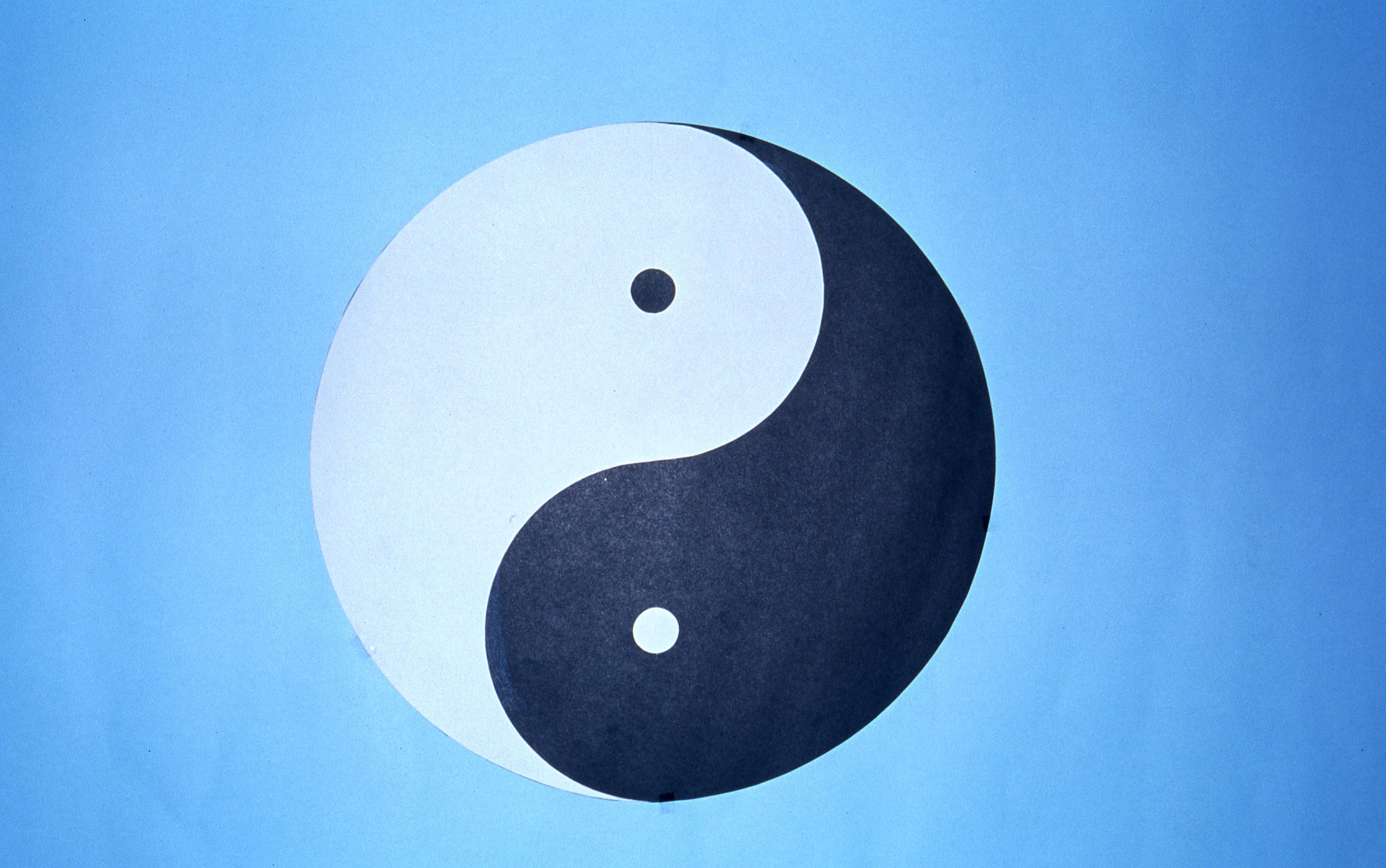 (太极图。一条曲线让阴阳相依相偎、相亲相爱、创造万有,一条线组成一个圆,表圆圆满满、生生不息。)