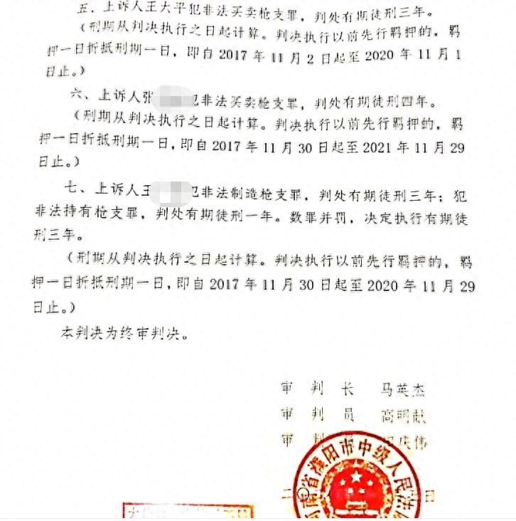 近日,濮阳市中院二审宣判:被告人胡敬、王太平犯非法买卖枪支罪,分别判处有期徒刑五年、三年。