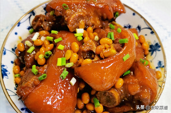 这道菜一定要放冰糖,这样才能赋予整道菜灵魂,肉的颜色不但漂亮,口感也很好吃,黄豆一定要提前泡软,这样才方便煮熟。