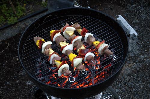 10.穿好之后 就可以生火烤串啦,羊肉快要烤熟的时候撒上孜然粉 辣椒粉