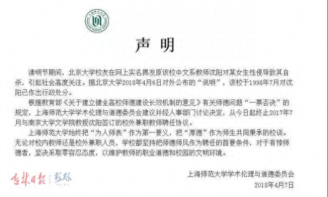 沈阳原任教学校北京大学、现在职学校南京大学、现兼职任教学校上海师范大学相继做出声明,均表示对此事情将密切关注,严肃处理。4月7日,南京大学文学院发表声明建议沈阳辞去南大文学院教职;上海师范大学发表声明终止沈阳聘任。