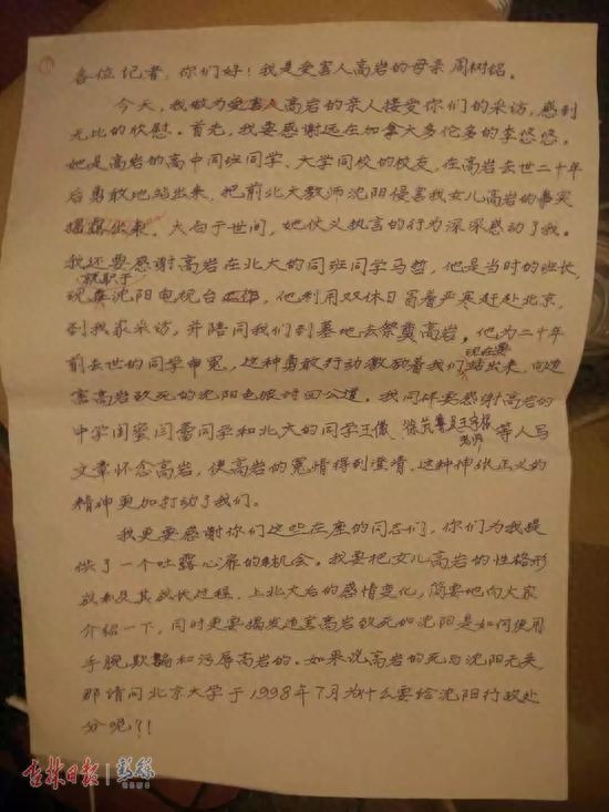 周树铭回忆,沈阳当年受到北大处分,她也是从高岩同学处听说。老人心中还发出追问:如果说高岩的死与沈阳无关,那请问北京大学于1998年7月为什么要给沈阳行政处分呢?!