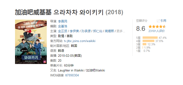 《加油吧威基基》在豆瓣评分8.6,是什么样的概念呐?!相比于其他的口碑好剧,比如韩剧《来自星星的你》8.3,《太阳的后裔》7.8,《孤单又灿烂的神》8.6,这些剧集都是当初我们全民追剧的回忆呀,这样比较大概可以了解到一点威基基的好看程度啦~