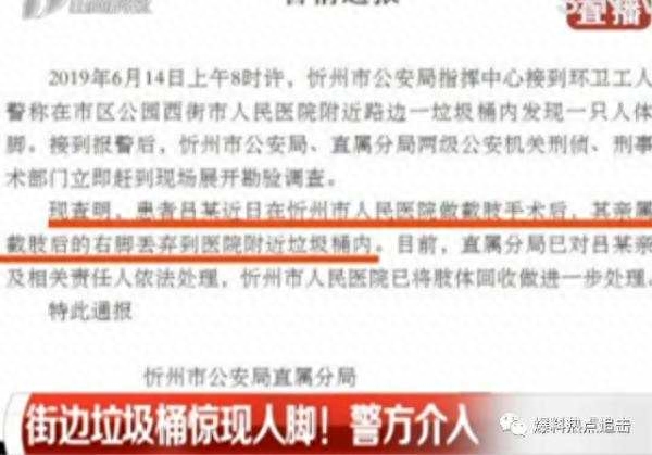 而警方在得到消息之后也快速的展开了调查,而事情的真相却让人感觉到哭笑不得,原来,这只是一个患者在做完截肢手术之后,被随手抛弃的截肢而已,这名患者吕某因为右脚发生意外,需要进行截肢,而吕某在山西忻州人民医院做完截肢手术之后,其家属将被截肢的右脚带走,但是又觉得没有地方处理,便随手抛在了医院附近街头的一个垃圾桶里面,在被环卫工人发现之后,才引发了这么一场闹剧,原来只是虚惊一场呀!