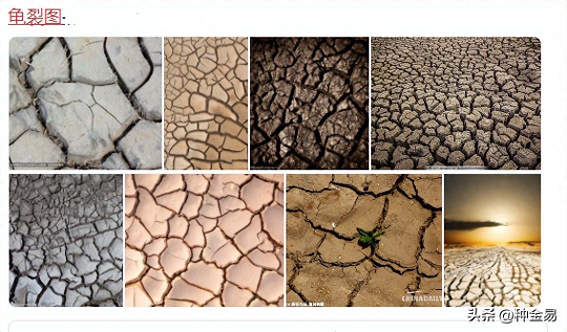 龟裂:(物体)裂开许多缝,出现许多裂纹。其实不仅田间地头的干旱,在许多树皮(如松树皮)、萝卜、西瓜等上也有这种情况。