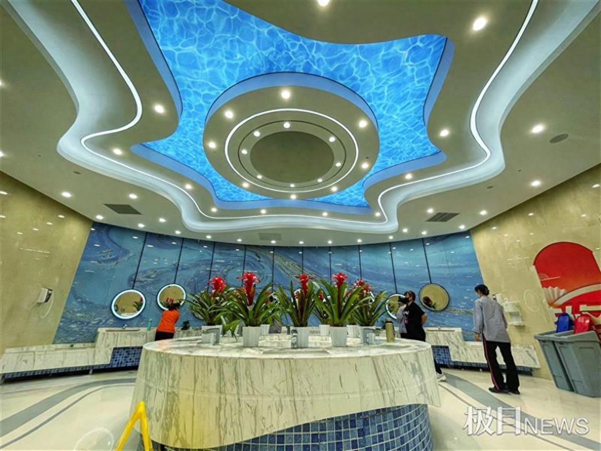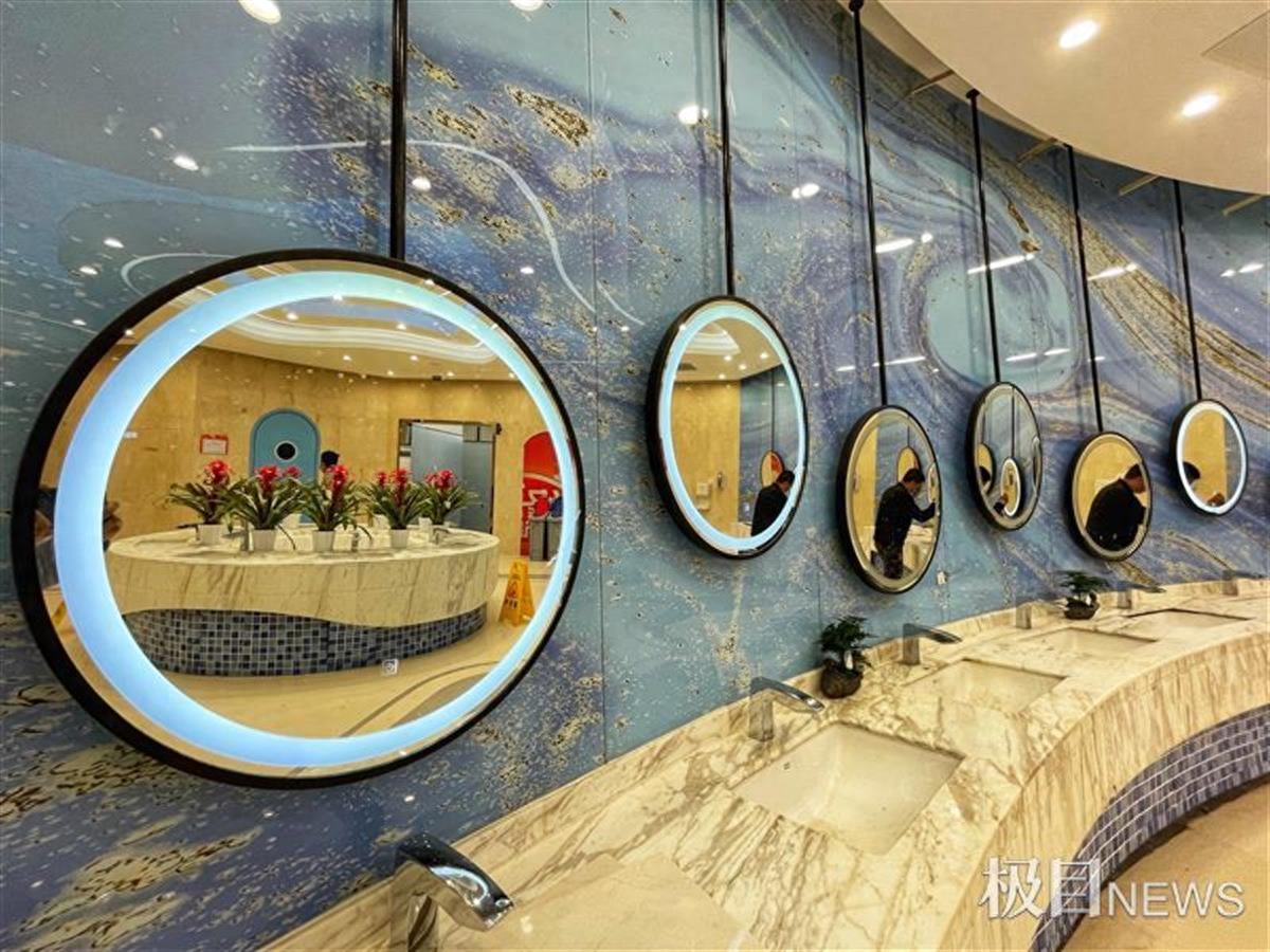 据了解,自2020年10月9日到2021年1月31日,辽宁高速公路实业发展有限公司对兴城服务区商业综合体进行改造。4月25日,极目新闻记者来到兴城服务区,只见数十名工人正忙着广场上的道路硬化等收尾工程。走进服务区大厅,钢结构造型玻璃屋顶和幕墙,宽敞明亮。洗手间内,圆形洗手台上摆满鲜花,墙面上挂着多面圆形镜子,走进其中,仿佛置身星级酒店。