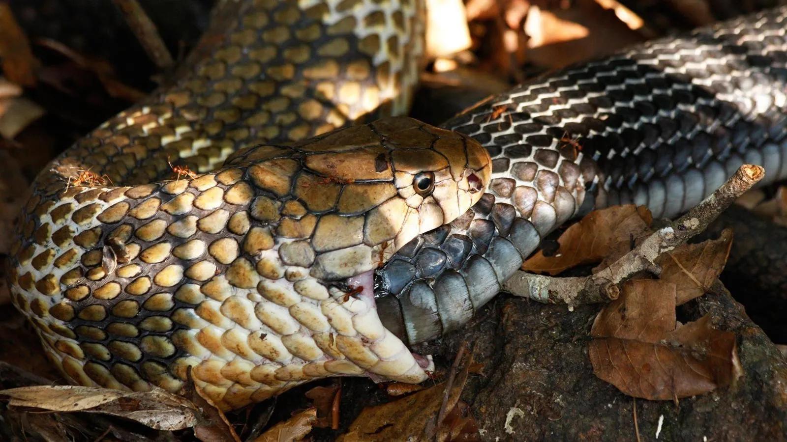 眼镜王蛇是专吃其他品种的蛇,所以它的出现令很多蛇类闻风丧胆,只要是属于它的地盘,其他的蛇就不敢在此出没。一旦这种眼镜蛇被惊吓到的话,便会凶性大发,被盯住的猎物肯定是没办法轻易逃脱。人若是不小心被咬中,大量的毒液会让他们在一个小时内毒发身亡。