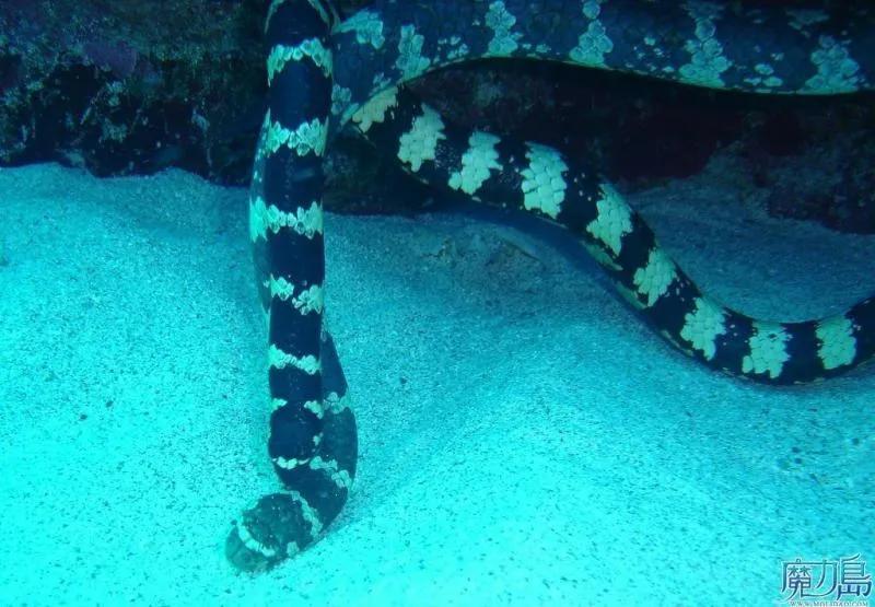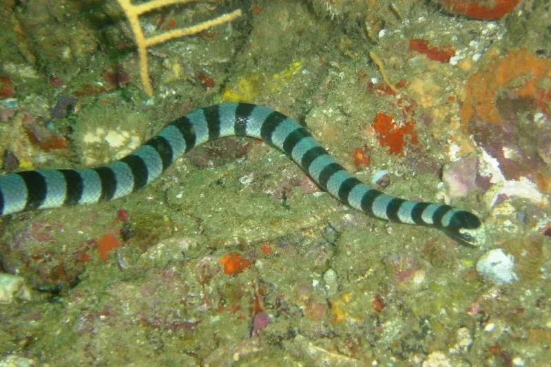 这种蛇生活在海洋里,体型细长,躯干略呈圆筒形。这种艾基特林海蛇的毒性可是比眼镜王蛇大得多,人若是不被咬一口的话,只需在短短十分钟内就面临死亡。澳洲艾基特林海蛇 (Hydrophis cyanocinctus),亦称"青环海蛇","斑海蛇",爬行纲,海蛇科。分布生活在热带海域,多在澳大利亚海湾浅水带。是生活在海洋里的爬行动物。有毒。长1.5-2米。其躯干略呈圆筒形,体细长,后端及尾侧扁。背部深灰色,腹部黄色或橄榄色。全身具黑色环带55-80个。生活在海洋中,善游泳,捕食鱼类。卵生。分布于我国辽宁、江苏、浙江、福建、广东、广西和台湾近海。我国沿海有23种海蛇,其中广东、福建沿海蛇资源丰富,以北部湾最多,每年可捕到5万多公斤。福建平潭、惠安、东山等各沿海县每年捕获可达1万多公斤。
