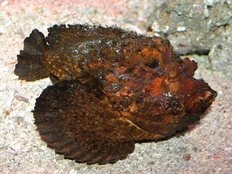 石头鱼属毒鲉鱼族,学名“玫瑰毒鲉”,因其像玫瑰花一样长有刺,且有毒,故而名之。石头鱼形状恐怖,体貌甚丑陋,活像一块石头,蛰伏在海底石堆中,不易被发觉。这种鱼,光滑无鳞,腹大浑圆,尾部侧扁稍窄,口在头的底部,形如新月,脊背灰白,略见石纹,腹色白中泛红,一般重0.5—1公斤,大者可达10公斤。石头鱼光滑无鳞,嘴形弯若新月,鱼脊灰石色,隐约露出石头般的斑纹;圆鼓鼓的鱼腹白里泛红,尾部扁侧稍窄。身长只有30厘米左右,身体厚圆而且有很多瘤状突起,好像蟾蜍的皮肤。体色随环境不同而复杂多变,象变色龙一样通过伪装来蒙蔽敌人,从而使自己得以生存。通常以土黄色和橘黄色为主。它的眼睛很特别,长在背部而且特别小,眼下方有一深凹。石头鱼类,卵生。6~7个月成熟,寿命4~5年,雄鱼身体细长,背鳍、臀鳍略长于尾鳍,末端尖。发情时胸部特别红。雌鱼腹部鼓,背鳍、臀鳍末端略圆,略短于尾鳍,胸部色淡于雄鱼。成对饲养于40~60×20~25×23(厘米)箱中,用4~5天的老水,繁殖水温25~26℃,雌雄鱼在无底花盆做的产床内钻来钻去,舔食花盆内壁,即要产卵。每窝产卵500~600枚,都粘在花盆内壁上。 将带卵的花盆取出,放入与上述水质、水温相同的水族箱中进行人工孵化,2~3天出小鱼,3~4天游起来,喂灰水2~3天;喂小红虫3~4天能吃蜘蛛虫,20多天倒入饲养箱中(用4~5天老水),再过10多天又可产第2次卵。红、蓝宝石、桔子鱼、玉麒麟、红肚凤凰、马鞍翅等鱼类都用此方法繁殖。世界上最毒的鱼,石头鱼的保护色与海底完美融合,它不主动攻击猎物,靠近它时,它的毒液会导致猎物瘫痪甚至死亡。马良山坐落在荆门城南的汉江之滨,山石潜伸河底,犬牙交错,是习性独特的石头鱼的栖息场所。因此鱼常年不离石头,活跃在水底乱石之中,故得此名。它的主要食物为水中虾、蟹、甲壳类昆虫等。每当十冬腊月是捕捞石头鱼的黄金季节。石头鱼躲在海底或岩礁下,将自己伪装成一块不起眼的石头,即使人站在它的身旁,它也一动不动,让人发现不了。常栖于海中的岩壁上,活象一块不起眼的石头。它的捕食方法很有趣,经常以守株待兔的方式等待食物的到来。它的硬棘(背鳍棘基部的毒腺有神经毒)具有致命的剧毒。石头鱼全部是天然的,无人工养殖,一年四季都有。石头鱼适宜生长在温度18~25摄氏度杂藻丛生的岩礁底层,喜欢半埋于沙中,初夏产卵,普遍长度在30厘米,每只重量一般在500克左右。石头鱼分布很广,在任何海域都有,但以热带及咸淡水交界为多。香港海域亦有石头鱼出产,又名“石崇”。