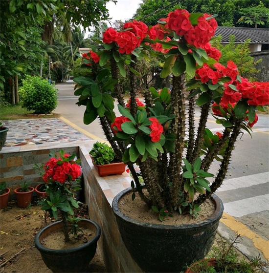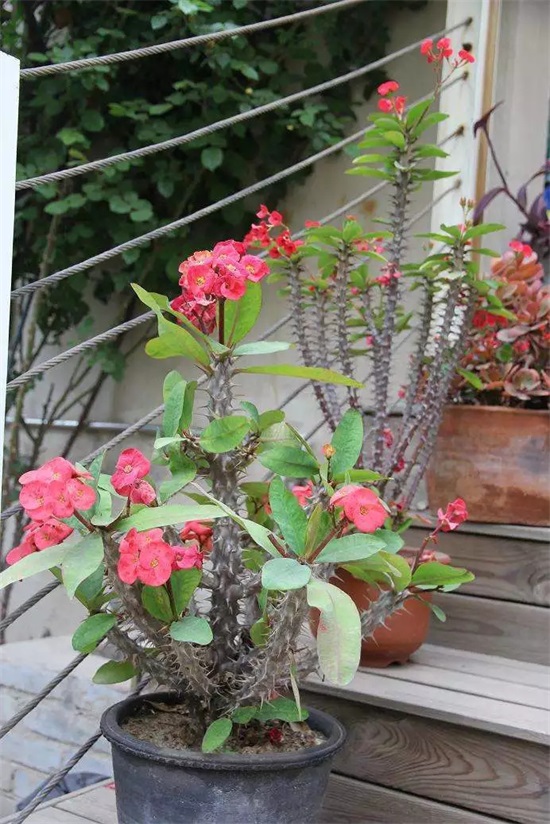 虎刺梅要被叫铁海棠,因为它开出来的小红花特别的精致可爱,像海棠花一样。天海堂的枝干上面长着密密麻麻的坚硬的尖刺,一副生人勿近的模样。
