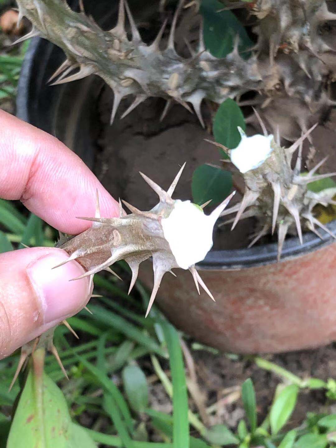虎刺梅是大戟科的植物,同属于这个科的,还有上面介绍的龙骨,一品红,麒麟掌等,它们几乎都是汁液有毒,掰断它们的枝干,都会像上图一样留出非常多的乳白色的液体,这个液体是有毒的哦。