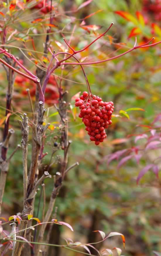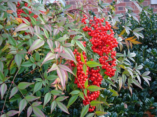 南天竹是一款十分常见的庭院植物。南天竹的枝干也是像竹子一样一节一节的,因此有竹的风韵。并且到了冬季,结出的果实一串一串的,红彤彤的,有着硕果累累的美好寓意,叶子也会在天气变冷的时候变得红红的,像枫叶一般好看。