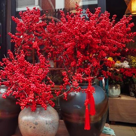 冬青果也是近几年比较流行的一款作为年花的鲜切花。枝头上密密麻麻地长着红红的果实,经久不凋,观赏性极佳,目前一只冬青果的枝条价格也不低,能够卖到几十元,甚至上百元。