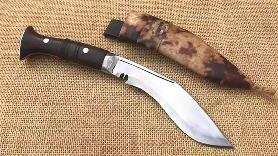 是尼泊尔的国刀,完全由手工制成,4个匠人足足花费一整天才能造出一把,整体刀型看起来很像一只狗腿,故而又被戏称为“狗腿刀”。头重脚轻,前宽后窄,用刀之人发力时通常将力量聚集到刀首之处,像斧子一样适合近战肉搏抡砍。刀身底部有用来引导鲜血的V形凹痕,背面附有两把小刀,一把用来削东西去皮,另一把用来磨刀。