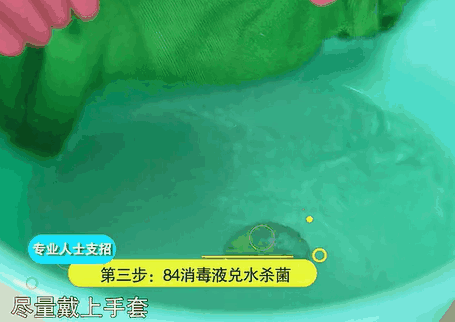 戴上手套,把毛巾浸湿,浸泡消毒液的毛巾仍然不要拧太干,然后用它继续擦拭墙面;