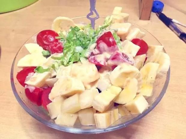 5.人参果沙拉。生菜一棵,圣女果10个,香蕉一根,人参果一个,沙拉酱一小包,将各种蔬菜洗净切丝,放进碗中摆盘,倒进沙拉酱,拌匀。
