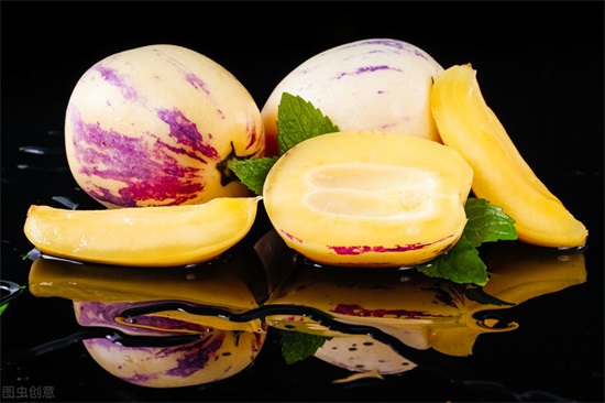 人参果(Pepino Melon)原名为香瓜茄,又名长寿果、凤果、艳果原产南美洲,果实成熟时果皮呈金黄色,外形似人的心脏。它的外皮儿淡淡的黄色,上面有紫色的条纹。给人一种小清新的感觉。吃起来有淡淡的清甜味儿。汁水特别甜美。