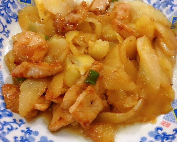 2.人参果炒肉片。人参果250克,猪肉100克,味精,植物油,料酒,葱花,酱油,精盐、姜末、粉芡各适量。先将人参果去蒂、洗净、切片,再将猪肉洗净、切薄片用上述各种调料腌一下,用淀粉抓匀。油锅烧热下肉片煸炒,七八成熟时加入人参果片和佐料,再炒熟装盘即可。