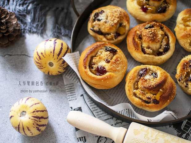 9.人参果面包卷。把人参果切成小块,加入锅中加细砂糖和肉桂粉用小火加热煮到微微透明,再加入蔓越莓拌炒,如果出水太多,可加入淀粉勾芡收汁,放凉后加入做面包的面饼中(面包制作与平时一样),卷起来,正常烤制就可以。