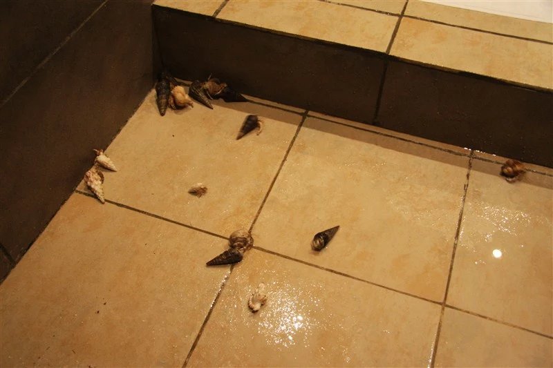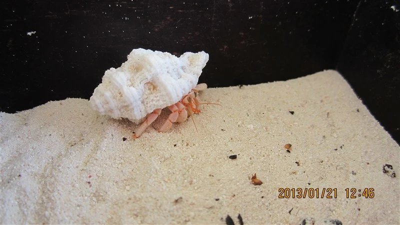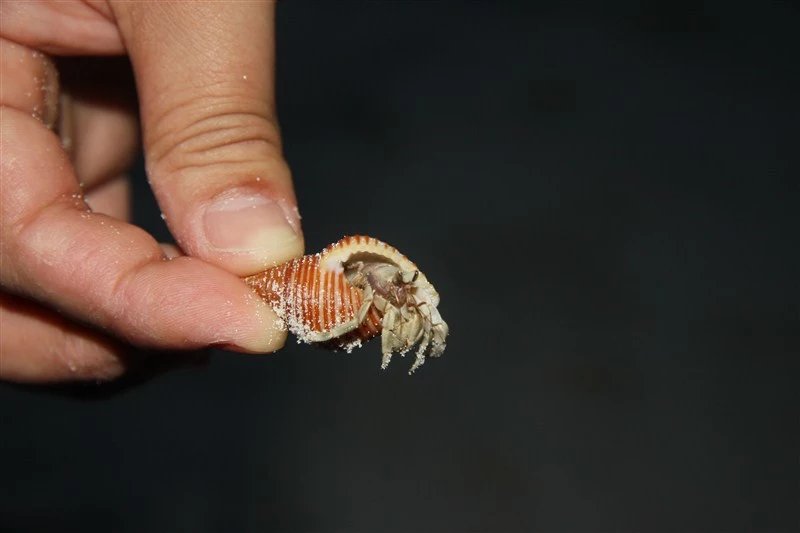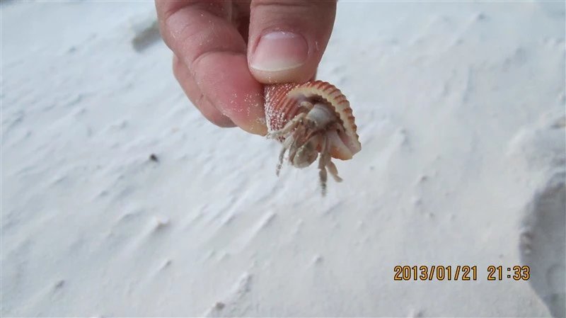 晚上,在沙滩上发现有很多寄居蟹,我俩打着手机的手电筒,抓了满满一桶寄居蟹,放在卫生间的浴池里。第二天早上起来,跑得只剩一两只。