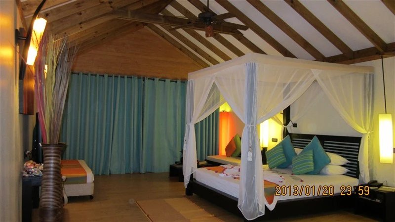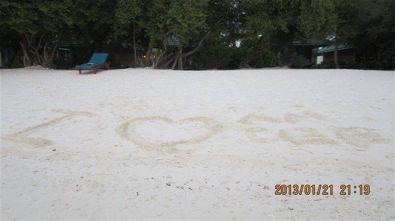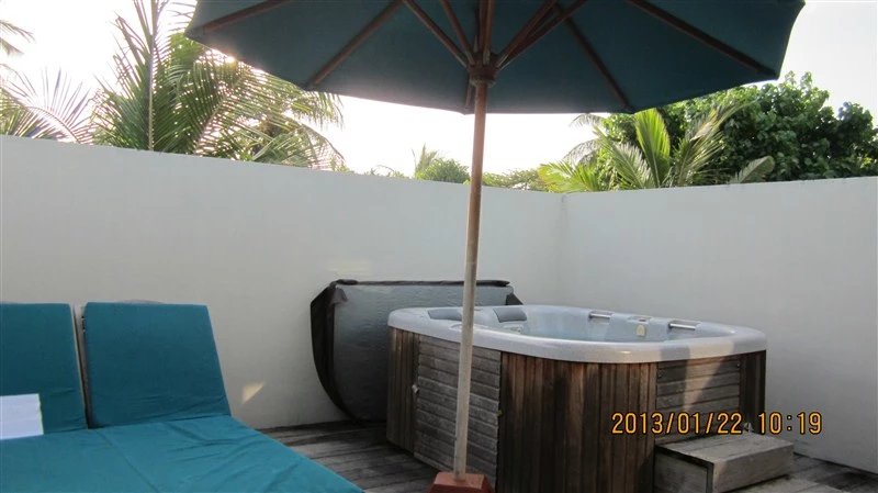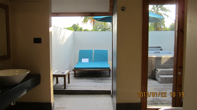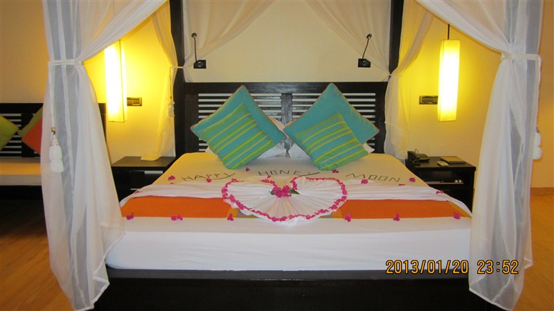 到达幸福岛时,已是下午,登记入住后,对客房还是非常满意的。客房是一个靠海的单独小院,正门隔着几棵椰子树就是海边沙滩,房内木质地板,床摆得很精致,玫瑰花瓣拼成的爱心图型(这个是需要在订酒店时备注的,算是新婚礼物,否则酒店不给准备),后院里有一个很宽敞的露天按摩浴缸,被院墙挡住,从外面是看不见的,可以享受露天按摩泡澡。