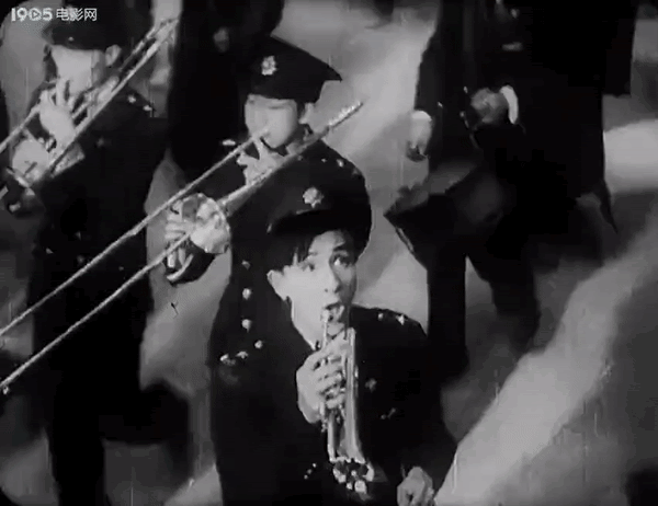 袁牧之和王人美在电影《风云儿女》(1935)中的片尾唱着《义勇军进行曲》的影像