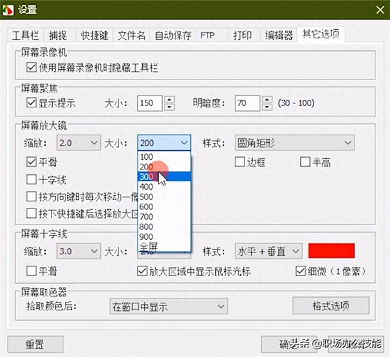 除了最基本的活动窗口截图、矩形截图、全屏截图等,它还有一些其他的小功能:比如屏幕放大、取色器,图片编辑器。