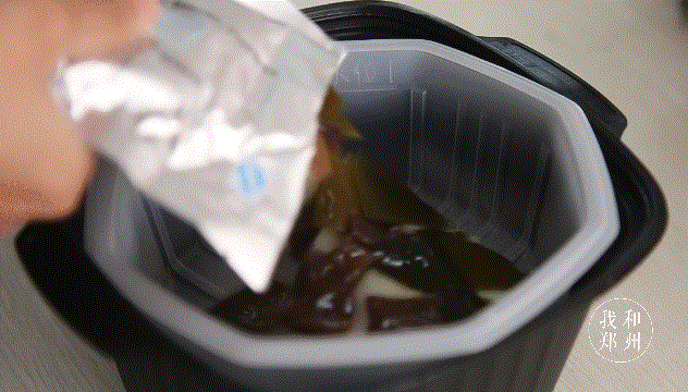 小火锅均分上下两层。料包在上,发热包在下。先打开底料包,将料包慢慢放入上层白餐盒。