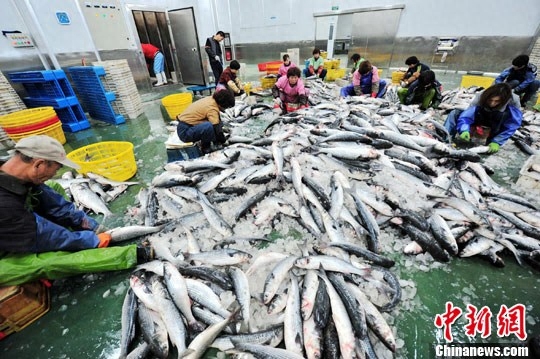 资料图:闽台合资福建钦龙食品有限公司加工车间内,20余名工人正在处理刚收购回来的海捕乌鱼。中新社发 张斌 摄