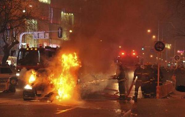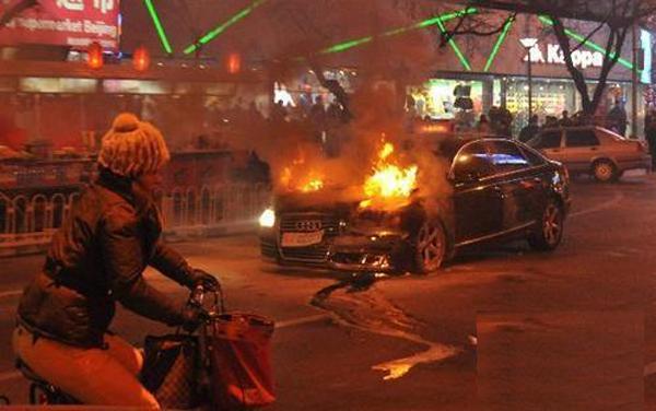 不过这样的场面如果不是看新闻报道,只看过程介绍 ,让人还以为这是发生在反应70年以前香港片中。就因为一个道路行驶方面的纠纷,用抢指对方脑袋,还不顾别人的危险和周围群众、财产安全快速倒车,故意撞击奥迪车前部。据目击者称,起初奥迪车前发动机处已在冒烟,然后有火苗蹿出。王珂拨打电话报警,民警到场后,立即疏散周边围观群众,并从美食城借出五六个灭火器开始灭火,但由于火势太大根本无法控制。王府井消防中队赶往现场,很快控制了火势。但车辆损失惨重,经鉴定,奥迪车损失达19.9万余元。这样的事情居然发生在我们的首都。真的让人感到震惊!!