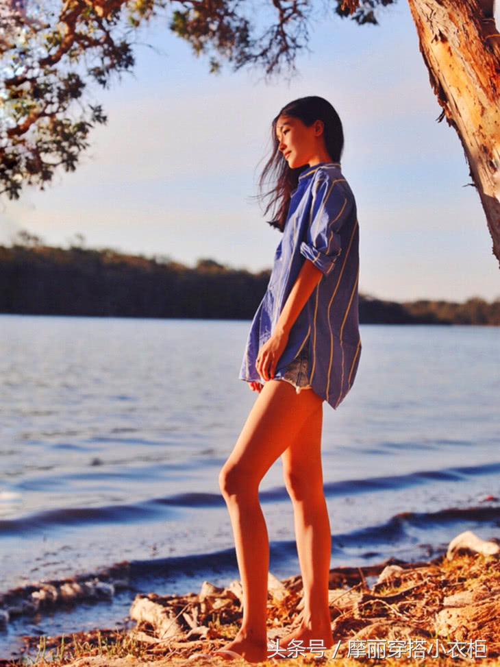 除了男友力十足的T恤可以穿出BF风的感觉,今年也是十分流行衬衫裙的搭配,分分钟将休闲帅气的BF风展示出,还能毫不费力的穿出时尚感。这件蓝色衬衫裙,加入条纹的设计,显得很有线条感,下身搭配牛仔短裤,衬衫正好遮住了牛仔短裤,无论正面还是侧面,都帅出了新高度。
