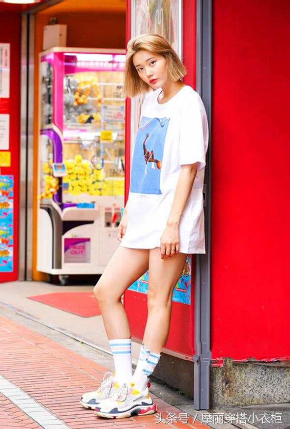 这件印花白T恤,也是oversize的版型,恰好的长度遮住下身的搭配,简单的造型就极具魅惑,大秀长腿,搭配一双ins上潮流的运动鞋,选一双中筒袜来搭配是,十分的减龄,很有运动感的BF风造型。