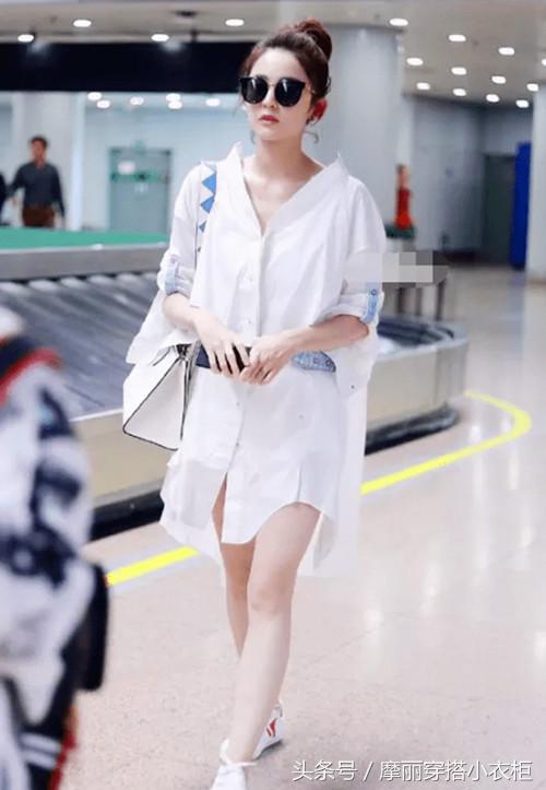 古力娜扎也将衬衫裙的搭配成功演绎了什么叫BF风,这件中长款的白色衬衫裙穿上显得皮肤更加白皙,衣角正好遮住大腿,下半身消失了感觉,十分的性感。脚踩一双小白鞋,很有feel!