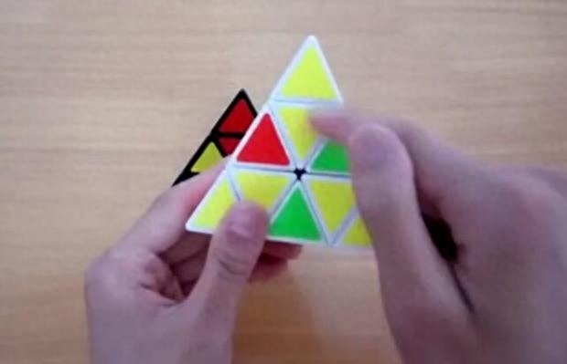 还原黄色底面,把黄色底面放在底面的位置,观察上角块的棱块位置有没有黄色棱块.此时,整个金字塔底层两个面块的颜色决定了这一层的颜色。要先确定哪一面分别是什么颜色