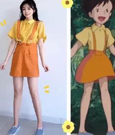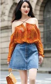 示范搭配:金色短衬衫+橙色短裙+蓝色单鞋+黑色背包