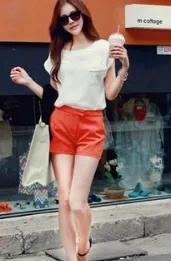 示范搭配:白色衬衫+橙色短裤+黑色高跟鞋+银色背包+墨镜